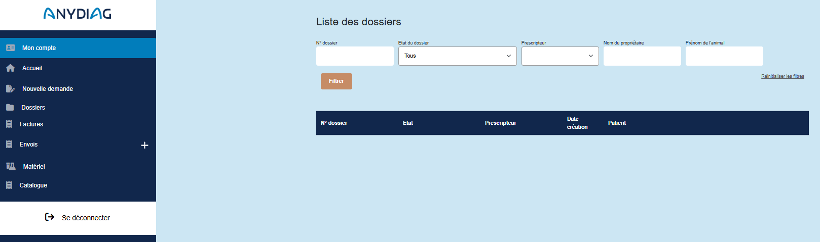 Nous sommes ravis de vous présenter la mise à jour de My Anydiag, votre plateforme d’analyses en ligne ! Plus intuitive et performante, elle vous permet de gérer vos demandes, suivre vos dossiers et accéder à vos résultats en toute simplicité.